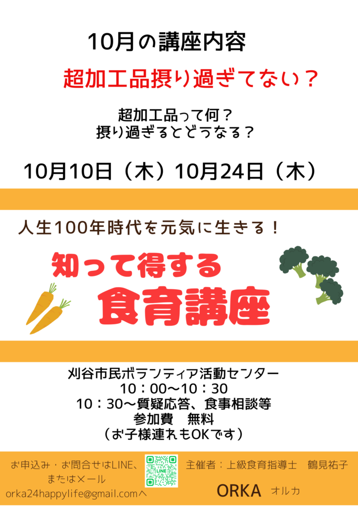 Campaign キャンペーン トップキャンペーン10月の無料食育講座 2024.09.29 10月の無料食育講座 今月のテーマは「超加工品」について普段の買っているものはどんな食材ですか?安全、安心な食材について考えてみましょう。 PrevBack to listNext
