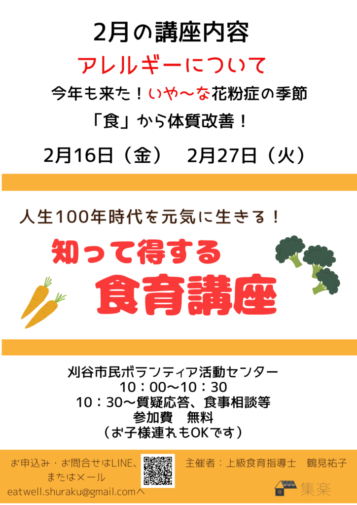 Campaign キャンペーン トップキャンペーン2月の無料食育講座 2024.02.10 2月の無料食育講座 今月はアレルギーについてのお話をします。 つらい花粉症の症状が出始めた方もいらっしゃると思います。 そんな方に「食」で体質改善をして、症状を軽くする方法をお伝えします! ぜひ聞きにきてくださいね。 PrevBack to listNext