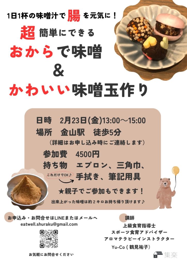News お知らせ トップニュースおから味噌&味噌玉作り 2024.02.10 おから味噌&味噌玉作り 2月23日(金)に金山にておから味噌と味噌玉作り講座を開催します。 味噌作りには興味があったけどやったことはないという方におススメ!混ぜるだけで手間いらずの味噌作りです。ぜひこの機会に手前味噌つくってみましょう。ご参加お待ちしてます。 PrevBack to listNext